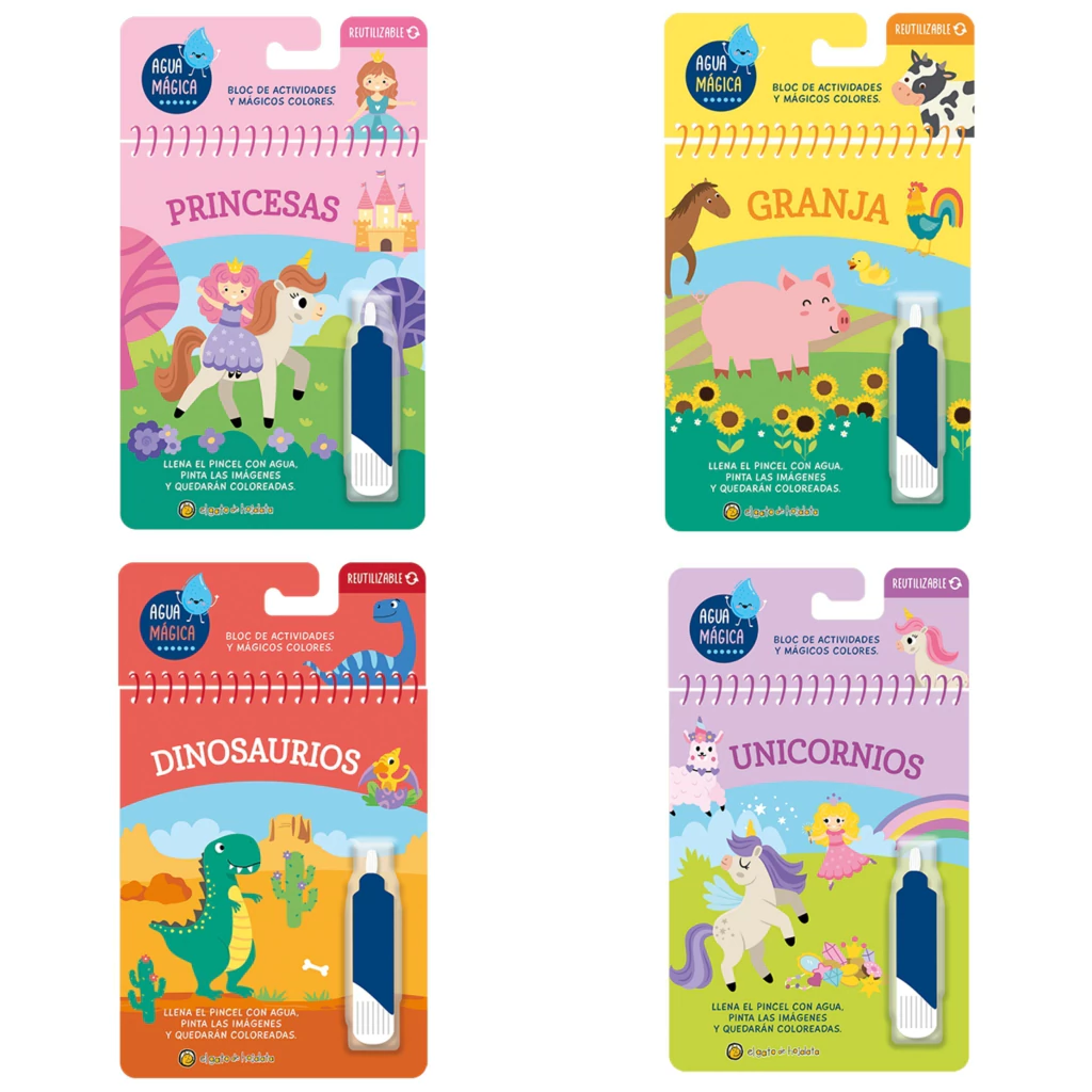 En esta colección podrás darle color a mágicas princesas, divertirte en el maravilloso mundo de los unicornios, pasear por la granja y remontarte a la época de los dinosaurios. Solo deberás llenar el pincel con agua y los colores aparecerán ¡por arte de magia!
