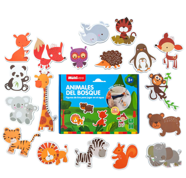 Un set didáctico en goma eva que permite explorar el mundo de los animales con diversión y aprendizaje. 18 simpáticos animales del bosque —como león, mono y jirafa— que despiertan la creatividad, la motricidad y el interés por la naturaleza. Pueden flotar en el agua, lo que ayuda a los niños a reconocer la percepción de la flotabilidad.
