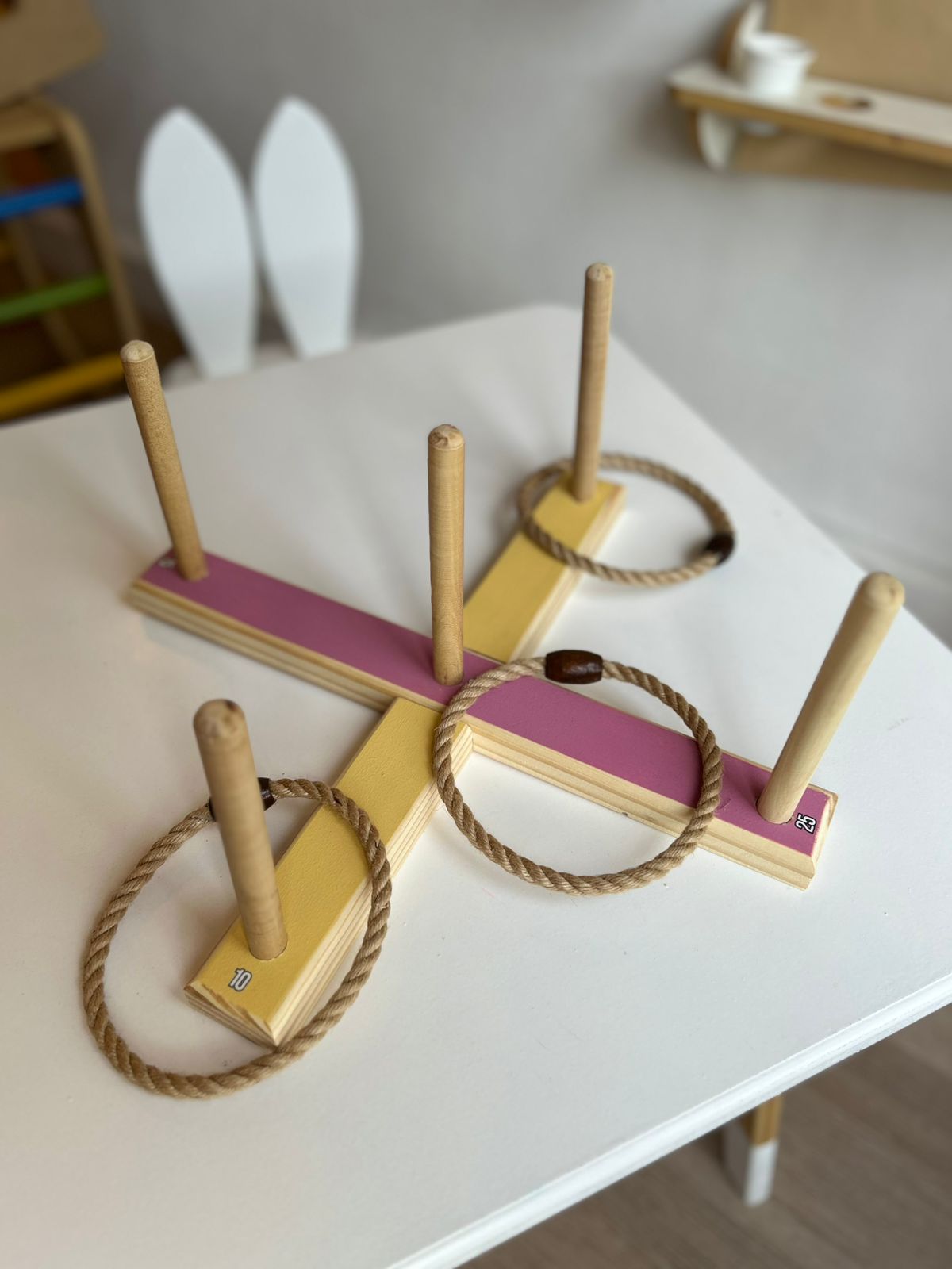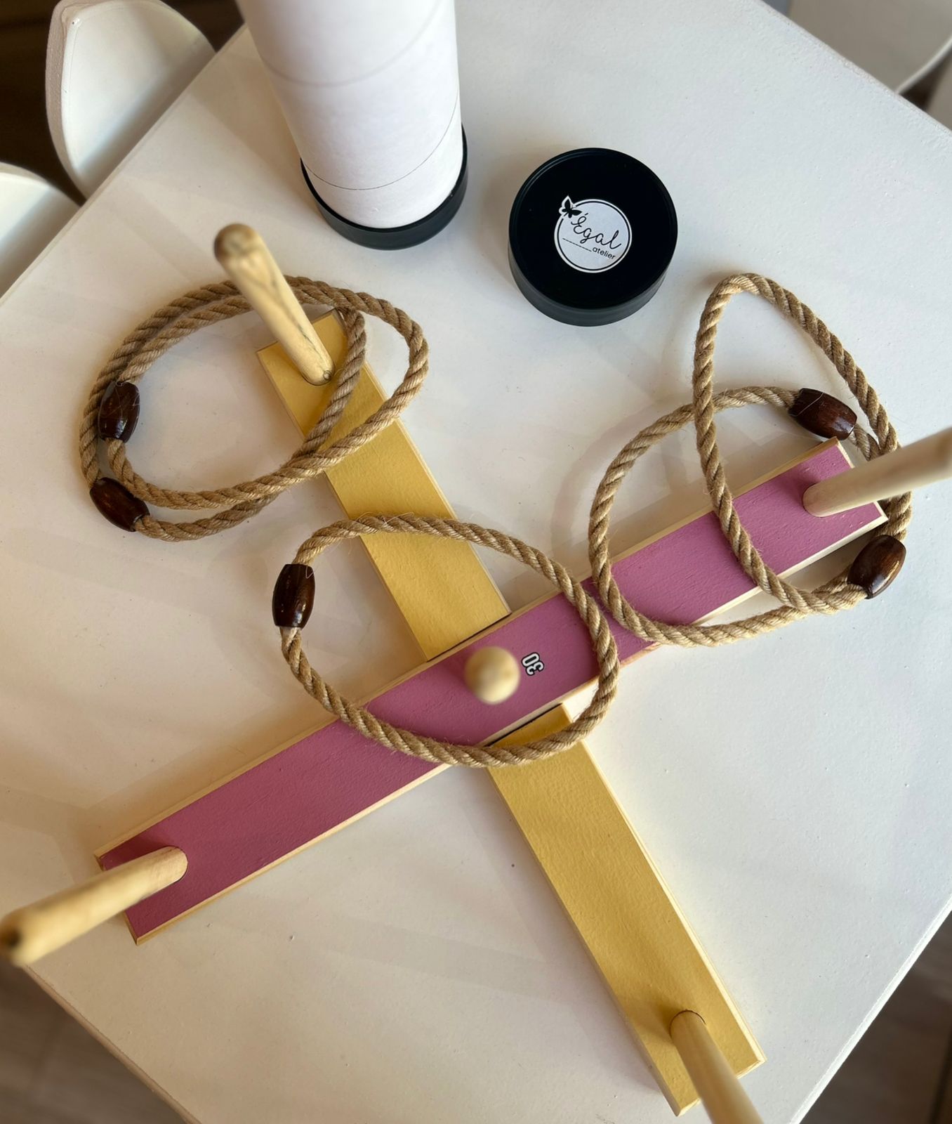 Aribu es un juego de ensarte De madera y aros de ensarte. De 0 a 100 años.