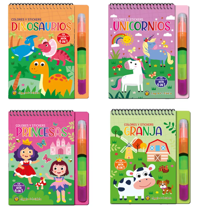Estos divertidos sets incluyen un libro para colorear, increíbles ilustraciones de los dinosaurios, los unicornios, las princesas y los animales de la granja; un rotulador con 4 colores en 1 neón, dos escenarios y muchos stickers. Además, bellas frases en imprenta mayúscula. ¡La opción ideal para estimular la imaginación de los pequeños!