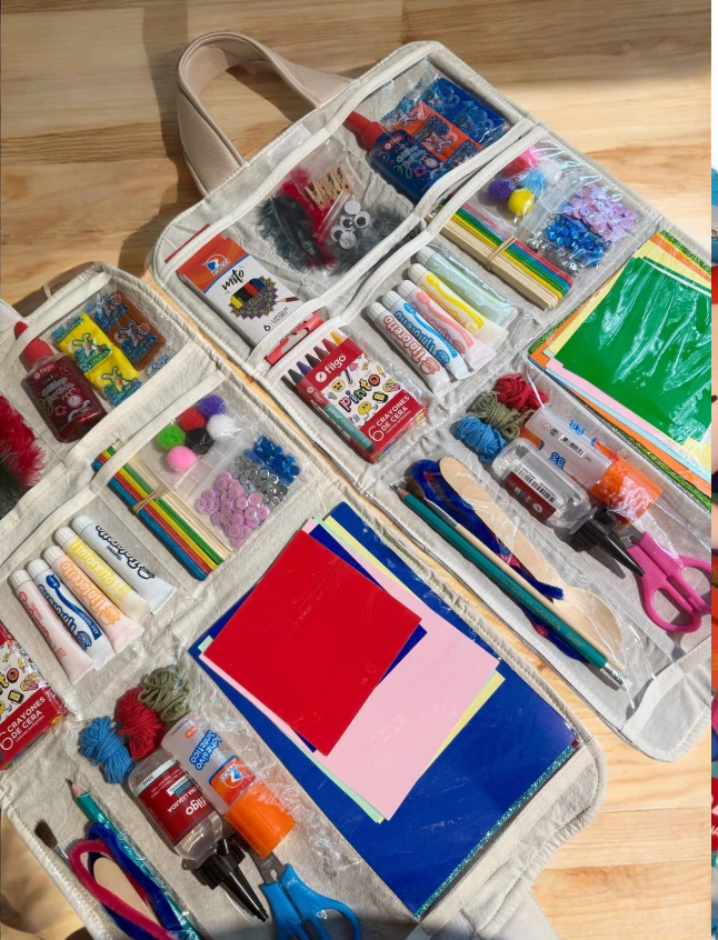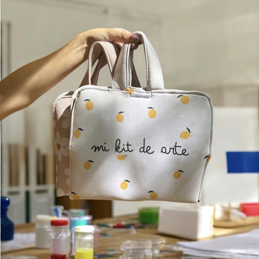 Kit de arte en hermosa valija de tela acolchonada, de fácil limpieza y secado rápido. Forrado internamente con textil color natural. Apertura y cierre con Velcro.