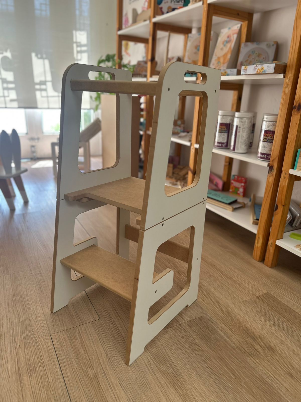 Esta realizada en madera MDF de 18mm, con barandas o bordes para darles seguridad, una estructura simple pero firme, facil de mover. Que les permite realizar todas las tareas facilitando su independencia y ayudandolos con su desarrollo.